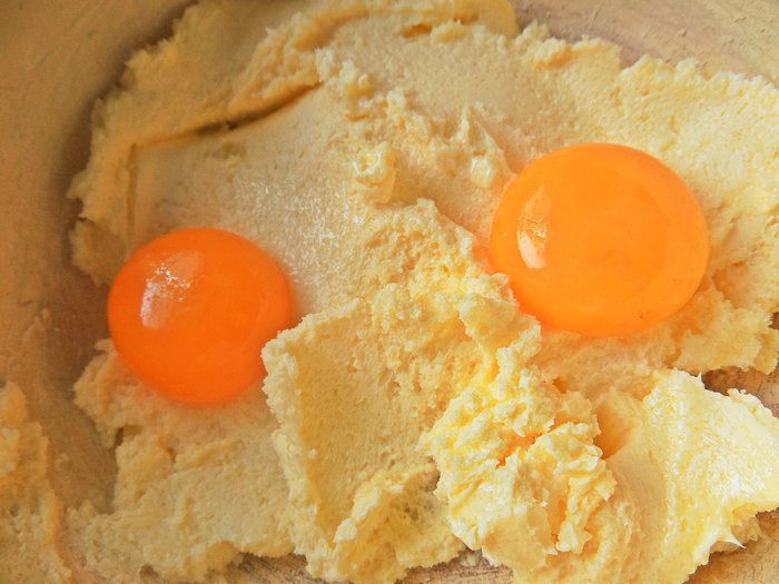 Отделить желтки от белков и добавить их в тесто.