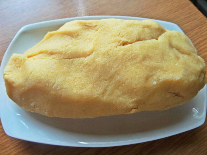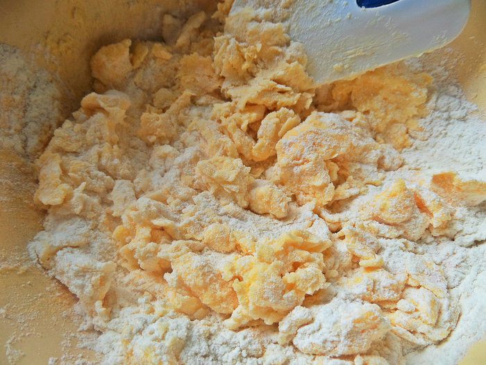 Затем вымесить руками плотное песочное тесто. Убрать на 2 часа в морозилку.