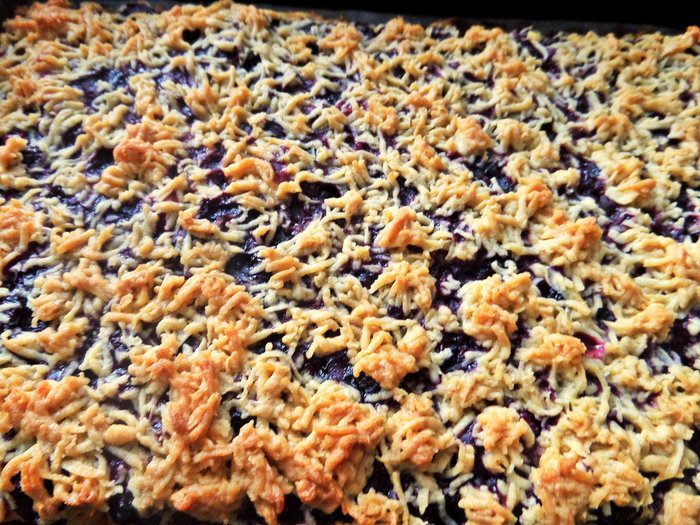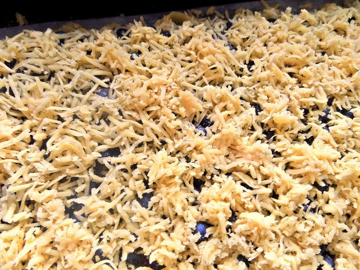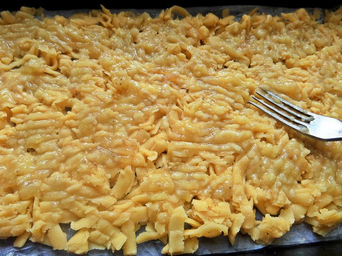 Застилаем форму (17 см на 31 см) промасленной бумагой для выпечки и насыпаем ровным слоем тертое тесто.
