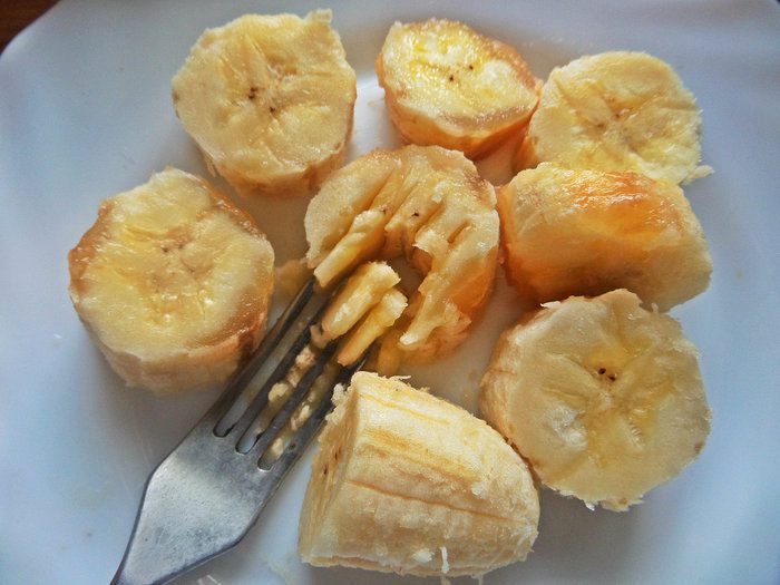 Переспелый банан размять вилкой.