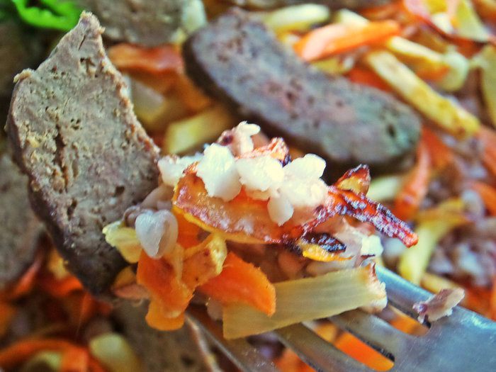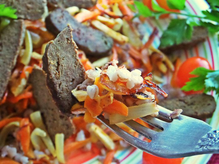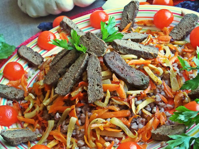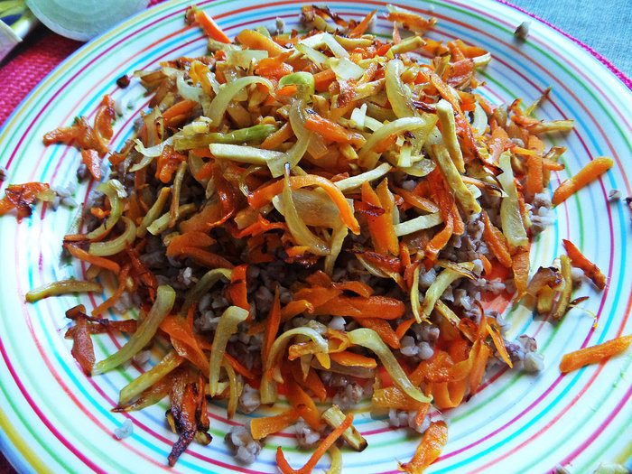 В это время сварилась гречка. Обычно я вливаю уже в выключенные рис, макароны или гречку ложку оливкового масла, но и любое ароматное масло от Biolio тоже подойдет. Перемешиваем с маслом.