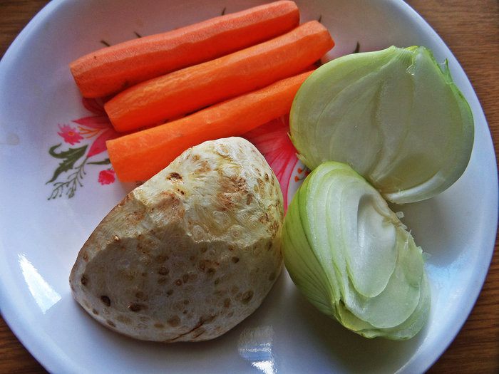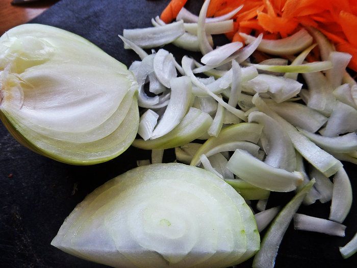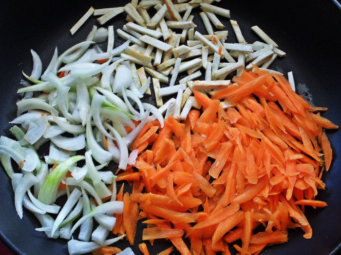 Сельдерей нарезать тонкими ломтиками. Затем соломкой.