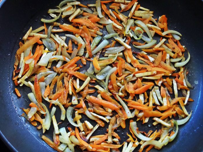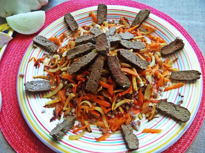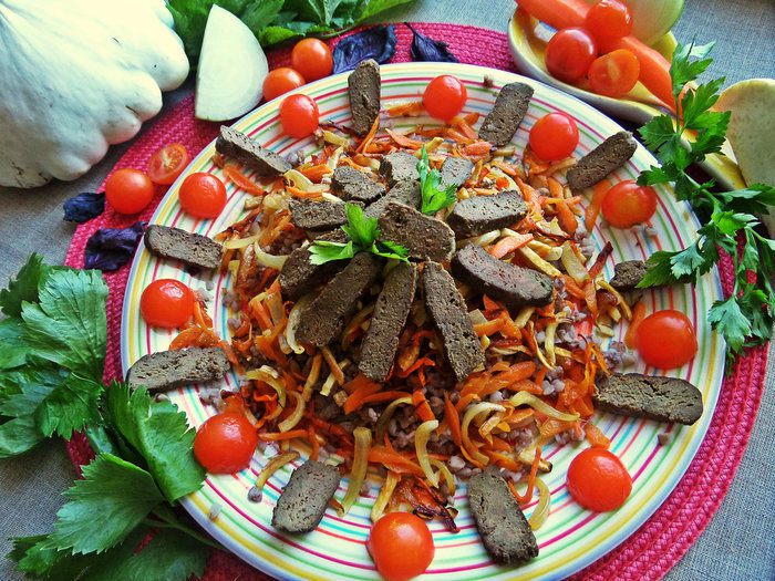 Полноценный ужин можно приготовить за полчаса! Пока варится крупа, готовим овощи и жарим печенку. Морковь я чищу заранее, сразу несколько штук, и держу в воде до востребования: хоть с майонезом/сметаной или вот так, под печенку.