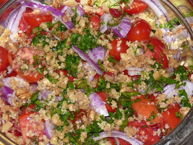 Перемешиваем все ингредиенты, добавляем зелень, заправляем ореховой смесью и даем настояться минут 10, чтобы салат пустил сок.