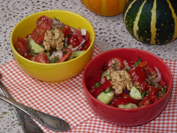 В каждой национальной кухне есть свой салат «по- крестьянски» или «по-деревенски». Предлагаю грузинский вариант вкусного и полезного салата. Тем более, что пользы прибавит ореховое масло от Biolio, а его аромат подчеркнет вкус блюда!