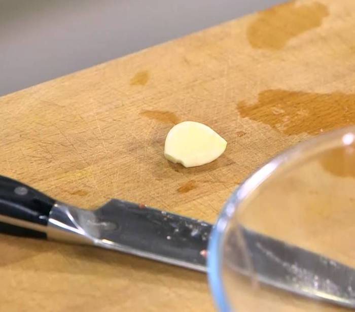 Чеснок почистить и раздавить плоской стороной ножа.