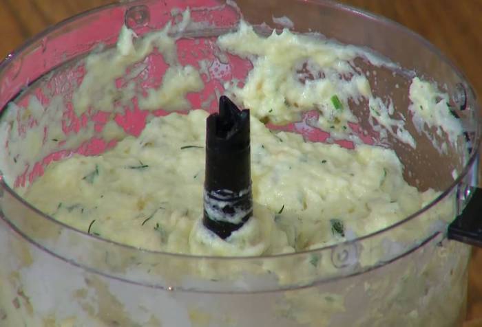 Треску разрезать на куски и вместе с луком измельчить в блендере, затем, не выключая блендера, добавить чеснок, каперсы, турмерик, яйцо и зелень, по одному ввести еще два яйца и взбить все в пышную массу.