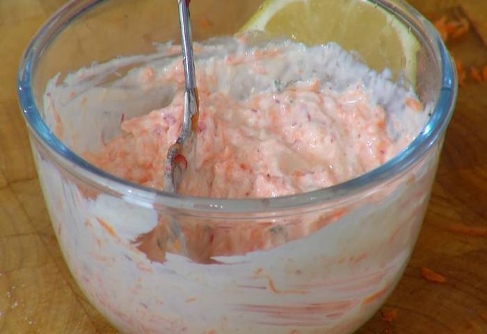 Приготовить соус: сметану соединить с хреном, морковью, редисом и листьями тимьяна, посолить, влить лимонный сок и все перемешать.