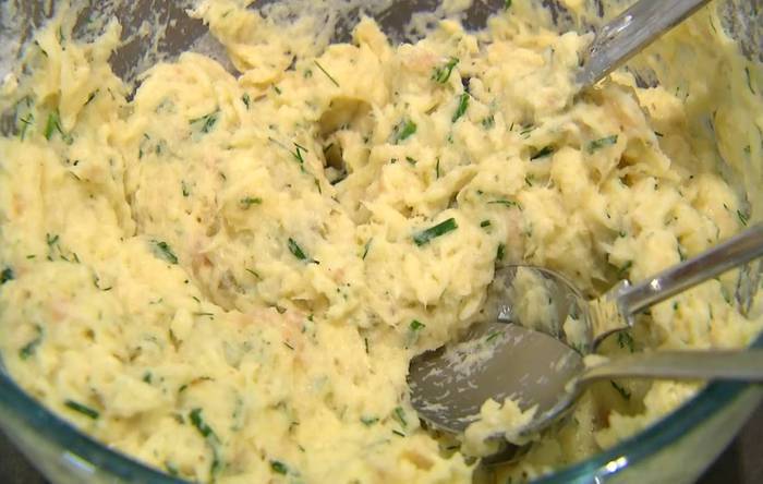 Рыбную массу посолить и поперчить, всыпать в нее муку и вымешать лопаткой.