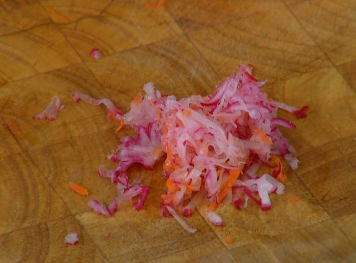 Редис натереть на мелкой терке.