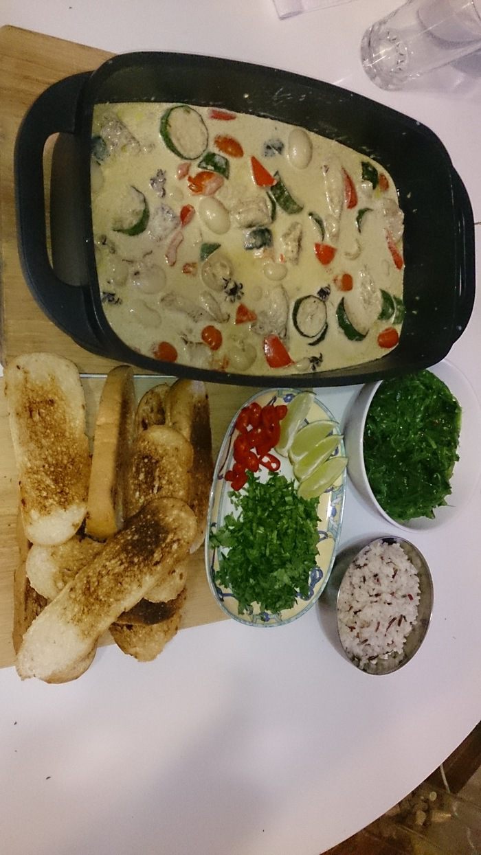 Осень, холода. Хочется чего-нибудь посытнее, поострее и погорячее! Вот и решил приготовить карри. Оно быват мясным, куриным, рыбным. Острое, пряное, ароматное, как раз то, чего и хотелось бы в такую дождливую и промозглую погоду. Блюдо несложное, очень вкусное и хорошо подходит для дружеской компании! Сегодня будет рыбное. Состав, конечно, недешевый, но оно того стоит. Кокосовое молоко (лучше 20 — 25%), паста карри (лучше зеленую, она очень ароматная и как раз к рыбе). И то, и другое есть практически в любом маркете, филе морского окуня, каракатицы, цукини, болгарский перец, шампиньоны, черри помидоры, консервированный ананс (кусочками). Приступим к приготовлению.