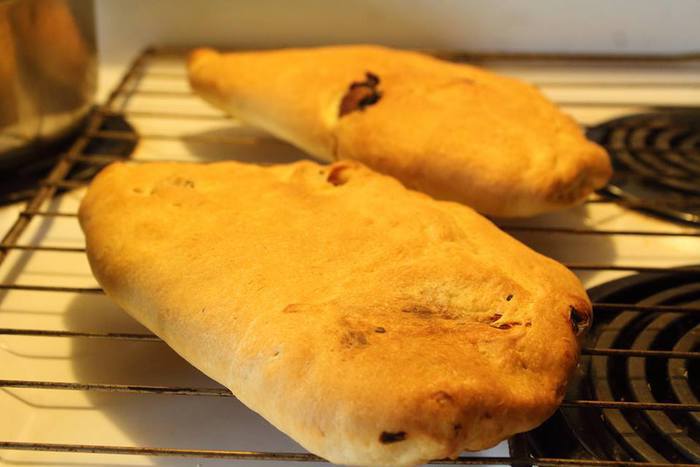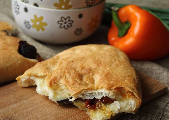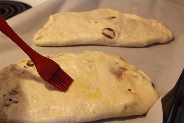 Каждую половинку теста раскатать примерно в 0,5 — 0,7 см толщиной. На половинку выложить моцареллу, помидоры и листочки базилика. Сложить, как вареник и закрепить по краям.