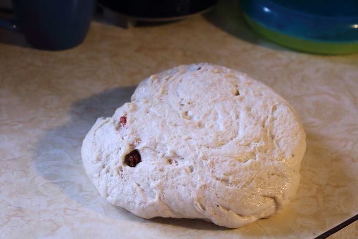 В подошедшее тесто вмешать половину приготовленных вяленых помидоров. Можно нарезать их, можно прямо целиком. И снова поставить под пленкой в теплое место минут на 30.