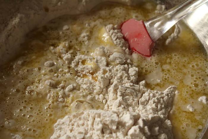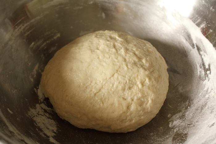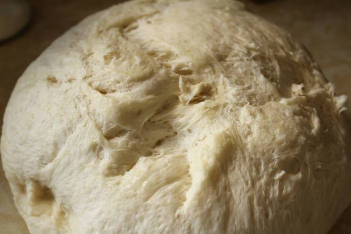 Чтоб не забить тесто мукой, на этапе «немного прилипает к рукам» можно смазать руки растительным маслом и вымешать тесто.