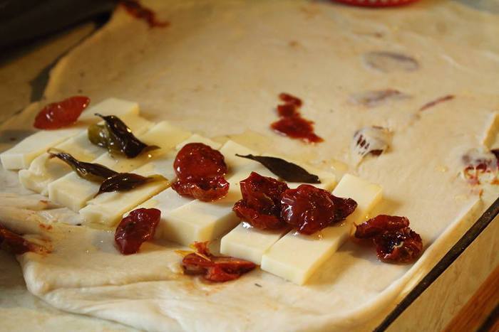 Фокачча с моцареллой, базиликом и вялеными помидорами.