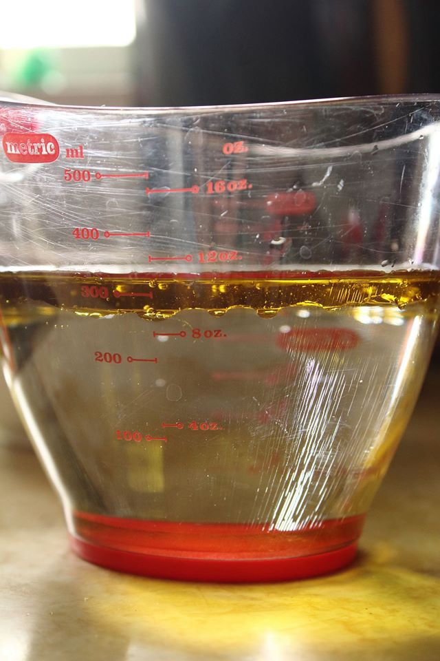 Теплую воду и масло смешать в емкости.