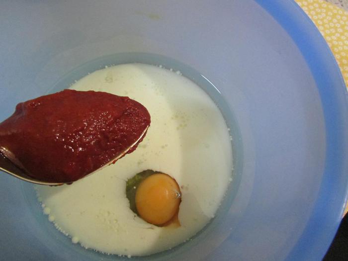 В миске соединить молоко, растительное масло и яйцо. Добавить томатную пасту и хорошо все перемешать.