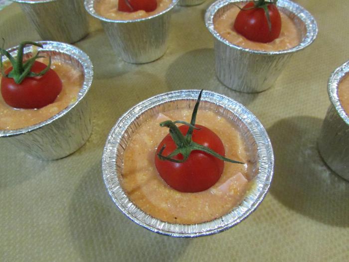 Готовое тесто разложить по формочкам. Сверху в каждый кекс кладем помидор-черри. Формочки поставить на противень и отправить в разогретую духовку до 200°С. Выпекать 20 — 25 минут.