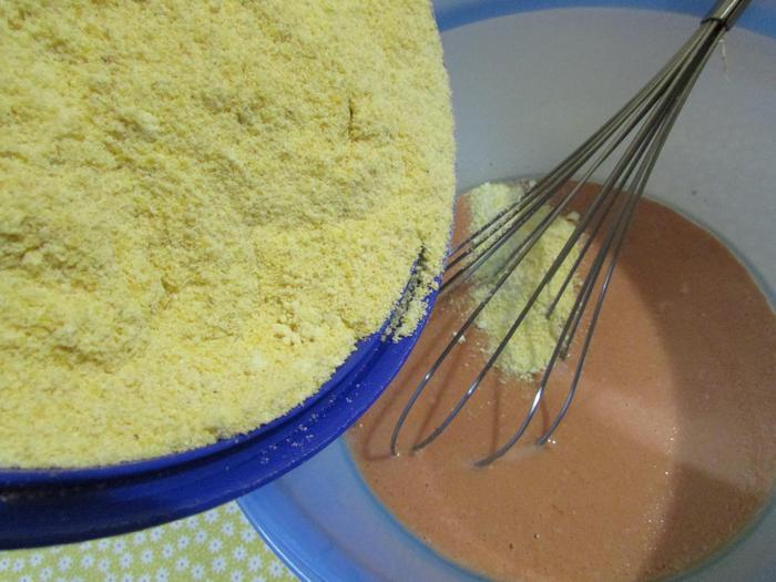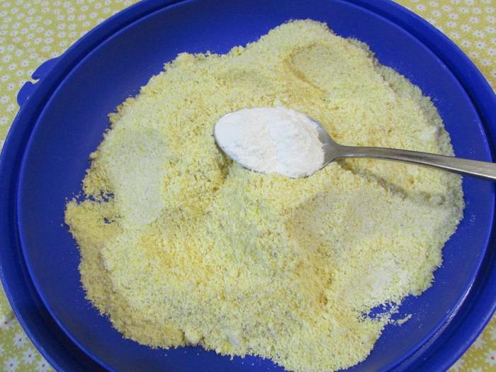 Отдельно соединить разрыхлитель теста и кукурузную муку (я смолола в кофемолке кукурузную крупу). Перемешать.