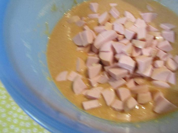 Затем вмешать сосиски.