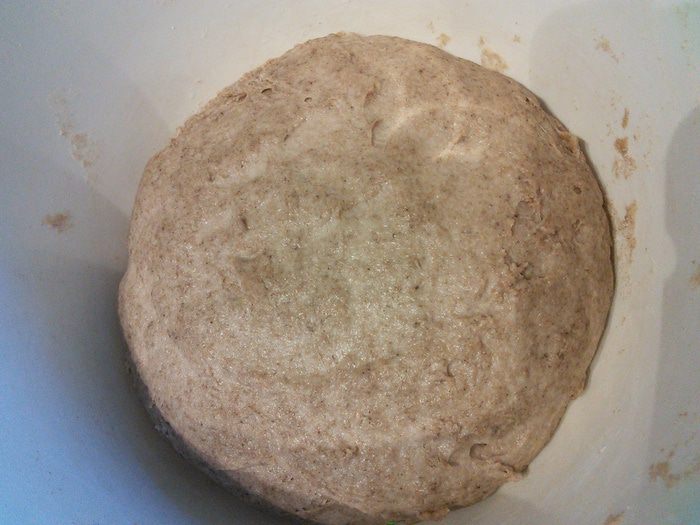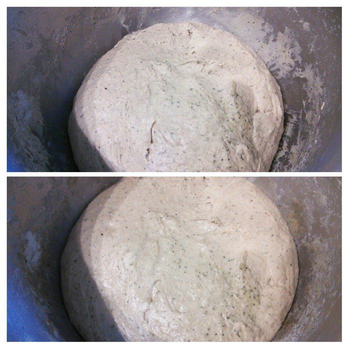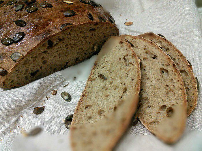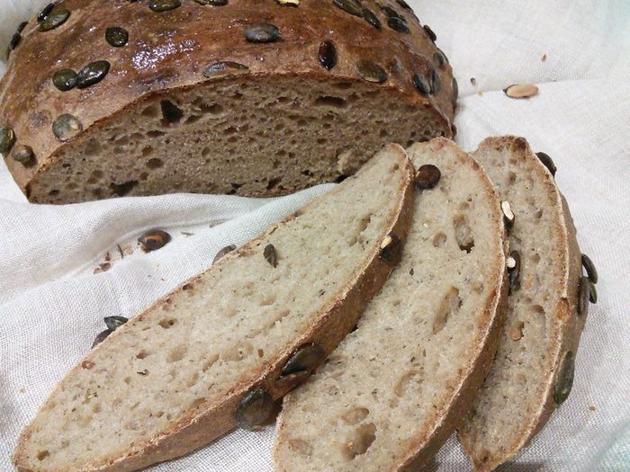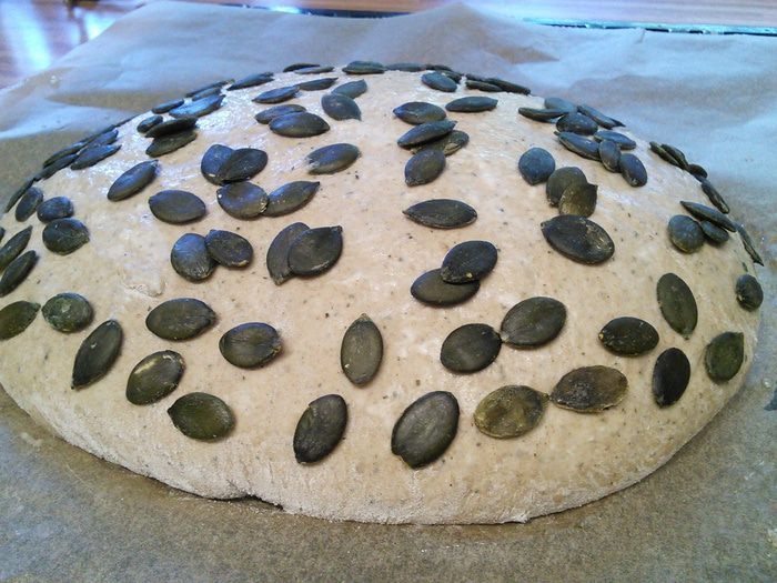 После 2 часов расстойки тесто выложить на посыпанную мукой поверхность, сформировать буханку, перенести «швом» вниз на противень, покрытый пекарской бумагой. Смазать водой и посыпать семечками. Накрыть какой-нибудь объемной крышкой, чтобы тесто не обветривалось, и оставить на отдых в теплой духовке на 1,5 часа.