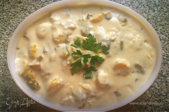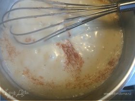 Вливаем 500 мл молока, помешивая восьмеркой, чтобы не образовалось комков, доводим до булькания (но не кипятим), и уменьшаем огонь. Солим, перчим, а также добавляем щепотку мускатного ореха и корицы, и 2 чайные ложки сахара. Варим минут 30-40 до консистенции густого соуса.