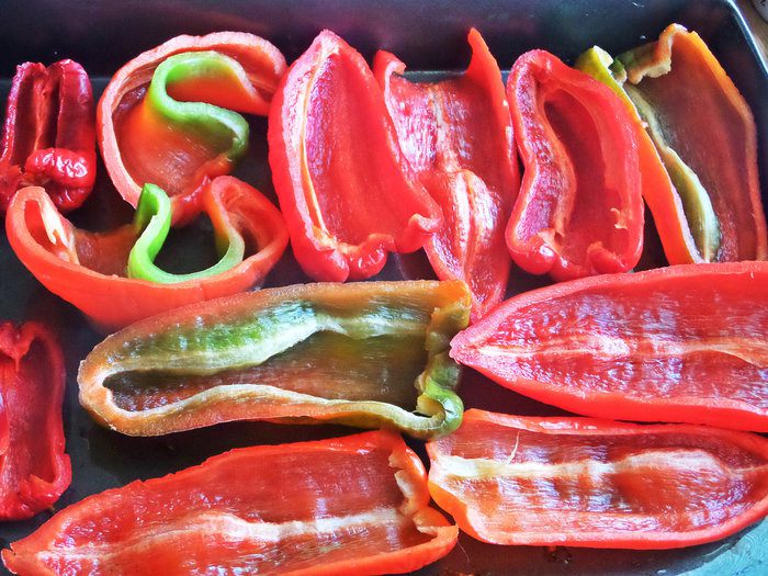 Перцы разрезать вдоль, очистить от семян и перегородок.