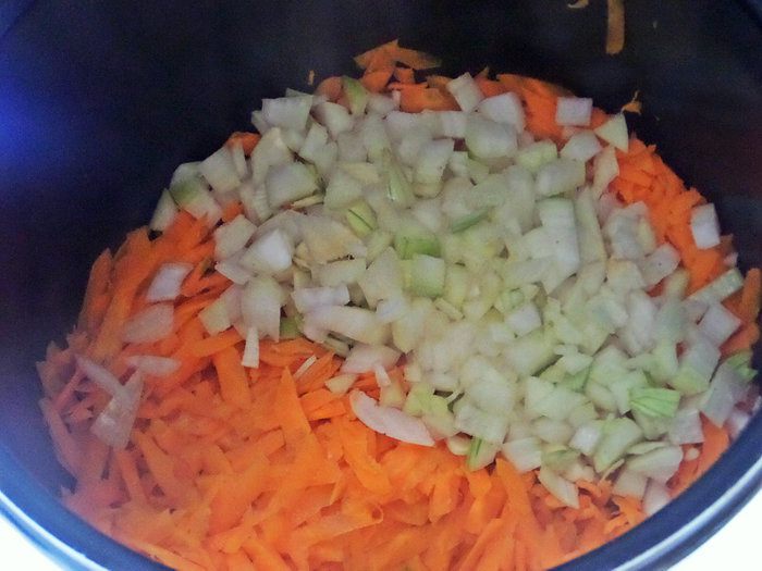 Высыпать лук с морковью в чашу мультиварки.