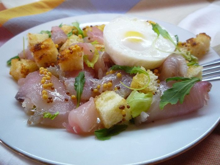 Этот популярный средиземноморский салат прижился и на моей кухне. И все это благодаря идеальному сочетанию нежных яиц пашот, сочной руколы, хрустящих крутонов и копченой рыбы! Особенную, неповторимую нотку салату я придала, добавив масло грецкого ореха от Biolio.