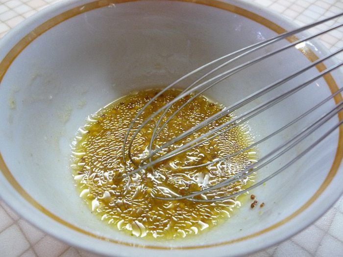Приготовим заправку. В небольшой пиале смешиваем горчицу, 1ст. л. уксуса, щепотку соли, 3 ст. л. масла грецкого ореха Biolio и 1 ст. л. кипяченой воды. Взбиваем венчиком до однородного состояния.