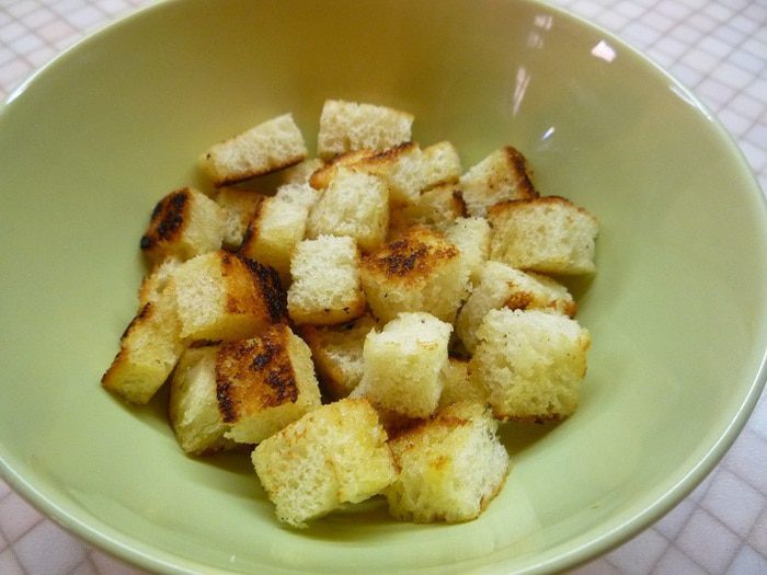 С хлеба срезаем корочки, мякиш нарезаем небольшими кубиками и обжариваем в оставшемся масле до румяной корочки.
