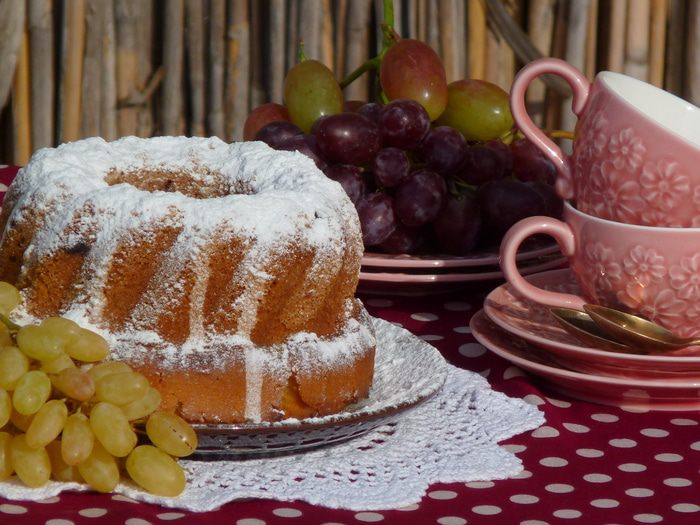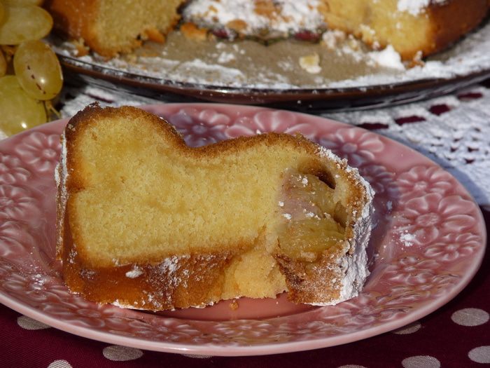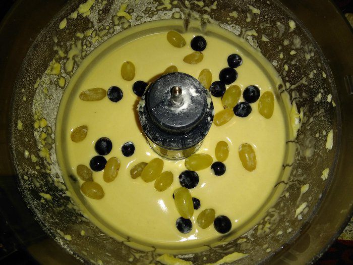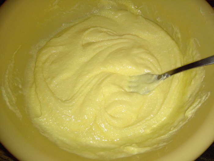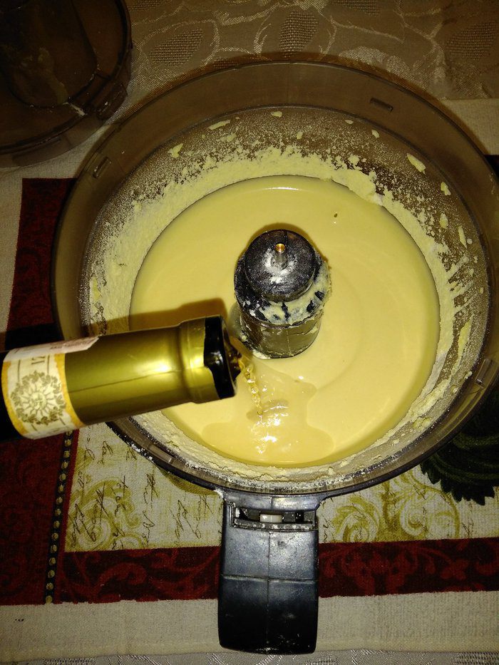 Тонкой струйкой медленно влить яйца, продолжая взбивать в масляную смесь. Взбивать до однородной массы (на медленной скорости у меня заняло минут 5). Муку просеять и соединить с разрыхлителем и постепенно соединить с яично-масляной смесью. Добавить вино, немного взбить.