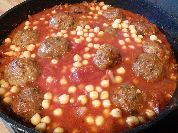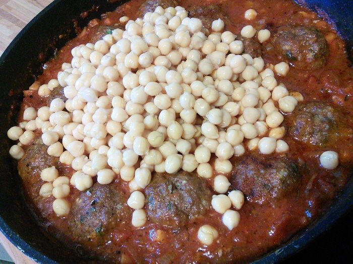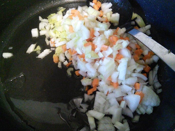 Нут нужно заранее отварить или использовать консервированный, как у меня. Готовим соус: морковь, 1 луковицу, кусочек сельдерея очистить, помыть и нарезать мелким кубиком. Прямо в кастрюле разогреть 2 ст. л. масла и пассеровать овощи до прозрачности, добавить 2 ст. л. томатной пасты от «Помидорки», размешать, коротко обжарить с овощами.