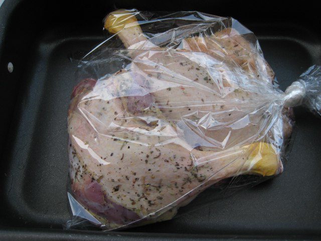 Духовку разогреть до 180°С. Положить утиные ножки в пакет для запекания, влить вино, пакет закрыть. Запекать 1,5 часа.