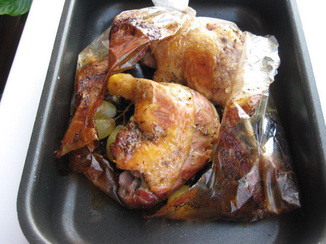 Достать утку из духовки, разрезать сверху пакет, положить виноград, влить воду, смазать утку медом. Вернуть в духовку, продолжить запекание еще 20 минут.