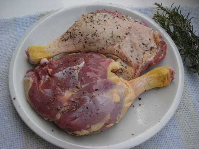 Утиные ножки посолить, поперчить, посыпать листочками розмарина. Оставить мариноваться на полчаса.