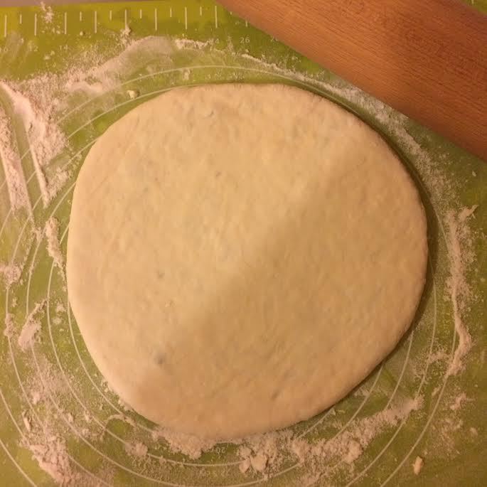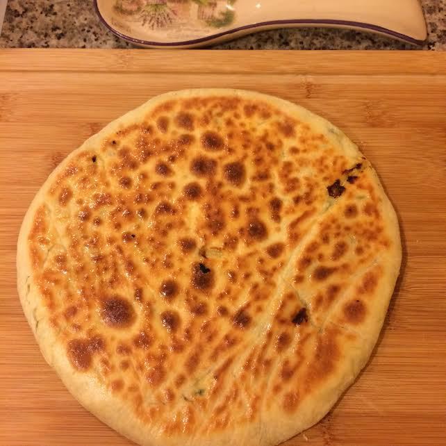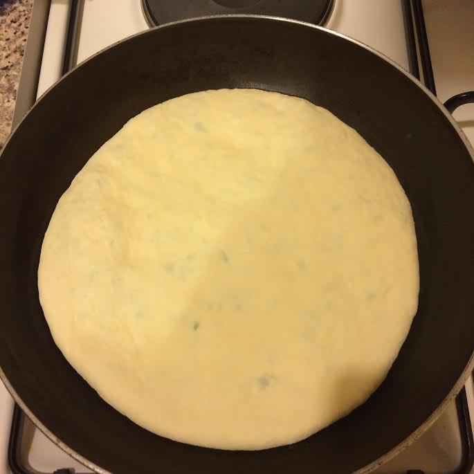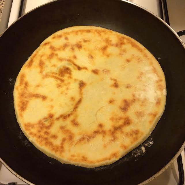 Сковороду нагреть, слегка смазать маслом как на блины, переложить лепешку на сковороду, распределить.