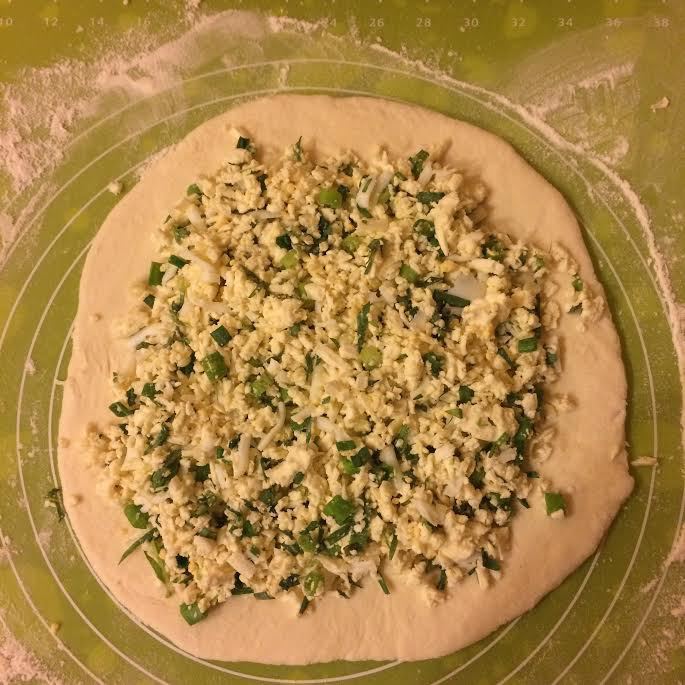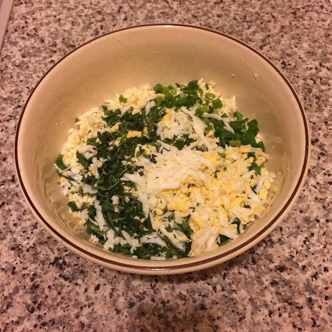 Готовим начинку. Тархун и лук мелко нарезать, добавить натертый на крупной терке сыр и вареное яйцо.