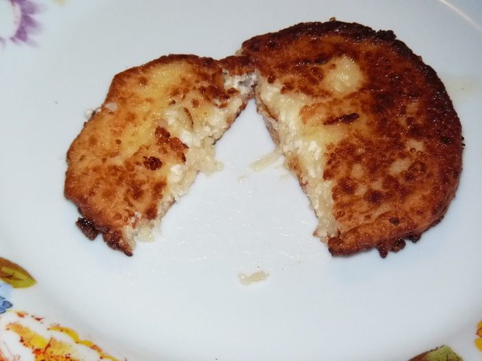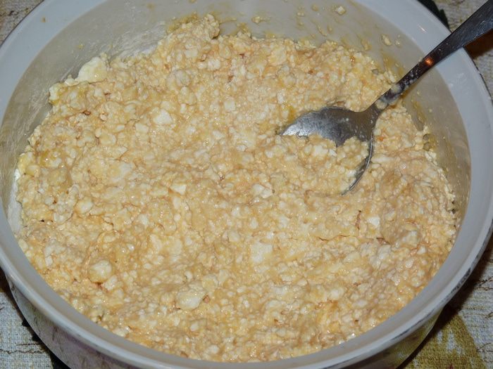 Сверху прикрываем сырной массой, присыпаем мукой и жарим.