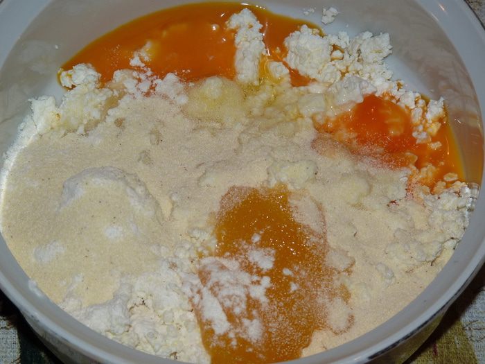 Перемешать вручную (чтобы сохранить зернистую структуру творога) все ингредиенты, кроме яблок. Оставить на 30 минут настояться. У меня творог деревенский, жирный. Если творог сухой, то достаточно двух ст.л. манки.