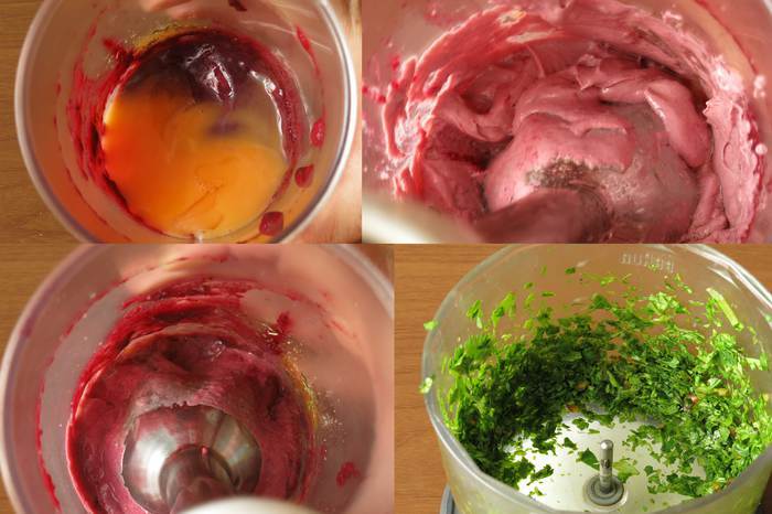 Разбиваем в сливовую массу 2 желтка. Взбиваем. Добавляем порциями масло растительное, льняное от Biolio, взбиваем 7 — 10 минут. Измельчаем зелень.