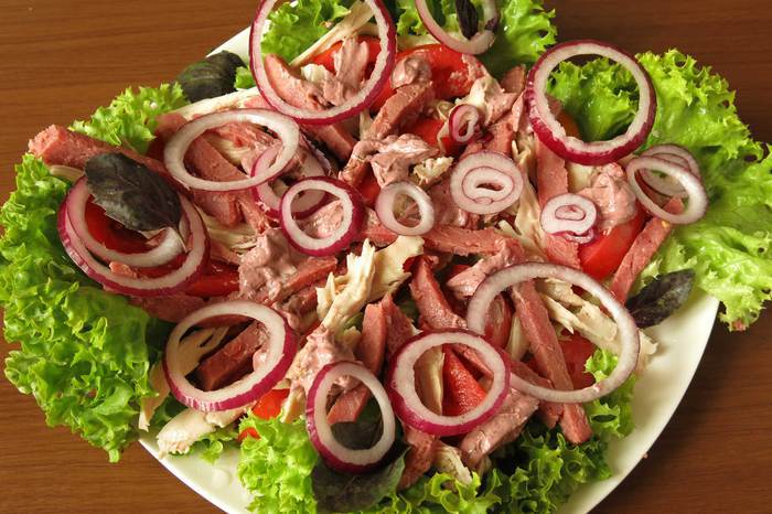 Попробуйте мясной салат с овощами, курицей, говядиной, красным перцем и томатами. Все выкладывается на листья салата, приправляется луком и майонезм-ткемали. Майонез-ткемали — мое изобретение, да простят меня кулинары аутентичного соуса за такие вольности. Соус-майонез готовится с добавлением пюре садового терна, приправы, традиционной для ткемали, мяты болотной, кориандра молотого, зелени кинзы. Основа — желтки и масло льняное (рекомендую использовать льняное масло от Biolio). Идею такого майонеза-ткемали подсказал рецепт майонеза с ягодами смородины красной, немного изменив способ приготовления и состав специй, я получила розовытый соус с выраженным вкусом ткемали, нежной текстурой майонеза на основе льняного масла.