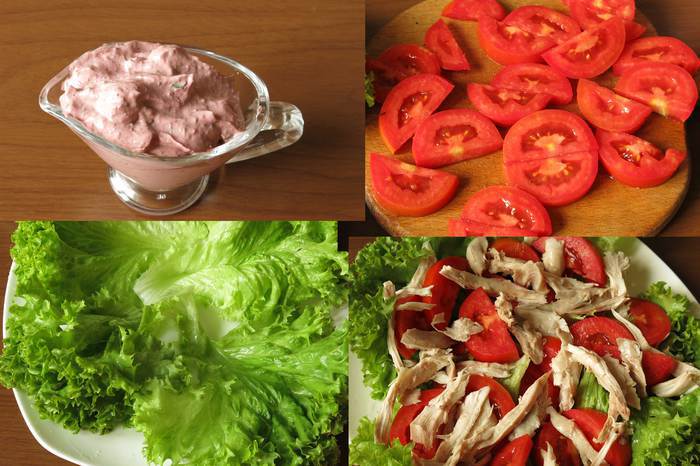 Добавляем к майонезу-ткемали зелень и чуть острого перца, перемешиваем. Нарезаем томаты. Выкладываем промытую зелень. На зелень — томаты и куриное мясо.