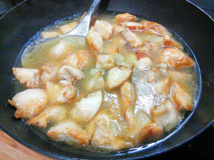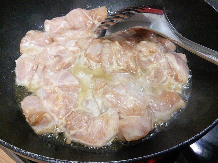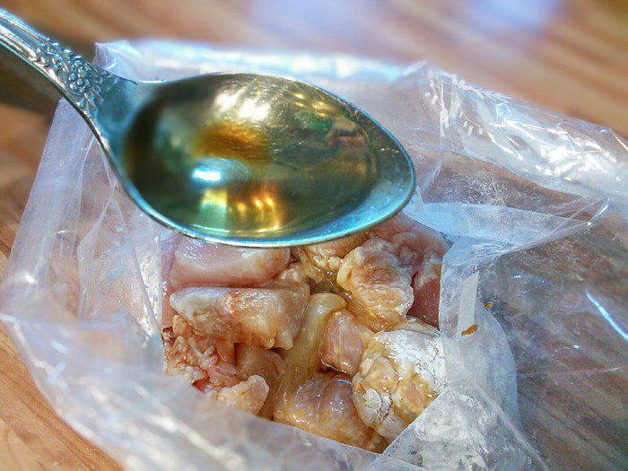 Куриное филе вымыть, обсушить и нарезать на порционные куски размером ~ 2 см. Взять плотный целлофановый пакет, сложить в него кусочки курицы, всыпать картофельный крахмал, влить соевый соус и масло с нейтральным вкусом. Отлично подойдет масло виноградной косточки от торговой марки Biolio. Все тщательно перемешать, закрыть пакет и поставить в холодильник мариноваться. Время маринования — от часа до «на ночь».