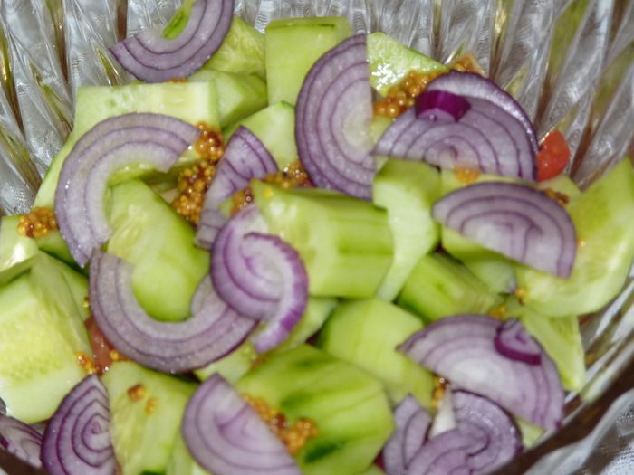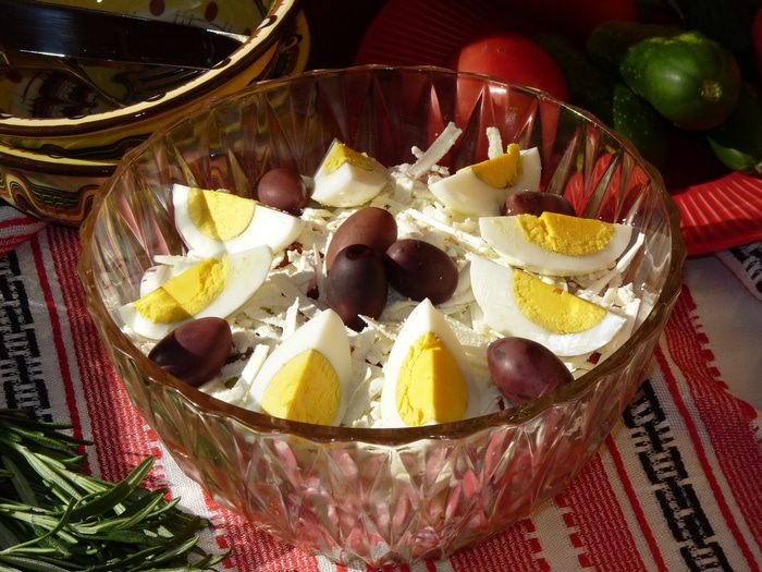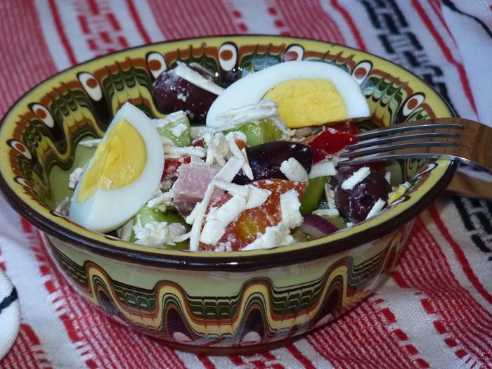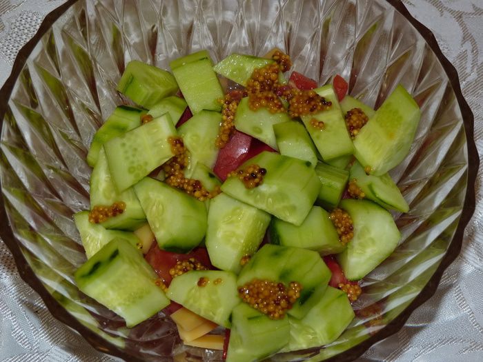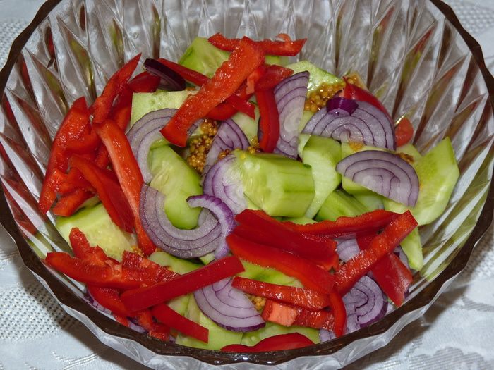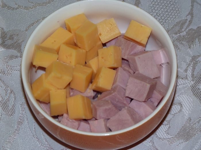 Болгарский перец нарезать соломкой, добавить в салат. Посолить по вкусу (тут следует учесть, что ветчина и сыр уже содержат соль). Перемешать все ингредиенты. Полить растительным маслом, я бы посоветовала тыквенное масло от Biolio — его изумительный цвет как нельзя лучше подойдет к этому салату, плюс — оно очень полезное!
