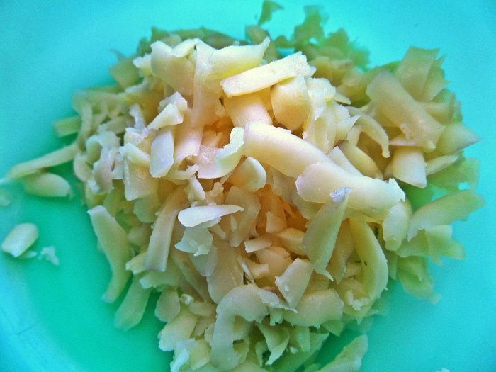 Картофель заранее отварить, крупно натереть.