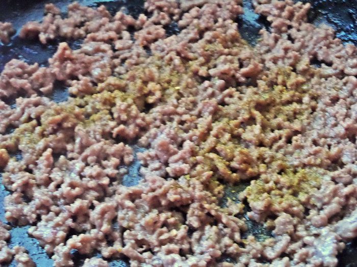 Размять фарш на горячей сковороде вилкой, перемешать с приправами для фарша. Жарить до выпаривания жидкости.