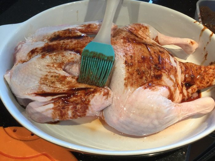 Утку промойте, обсушите бумажным полотенцем, выложите в форму для запекания. Смажьте утку маринадом со всех сторон и внутри.