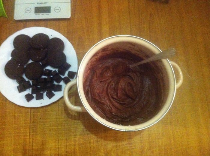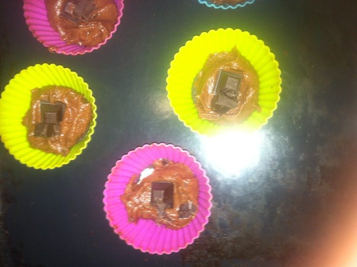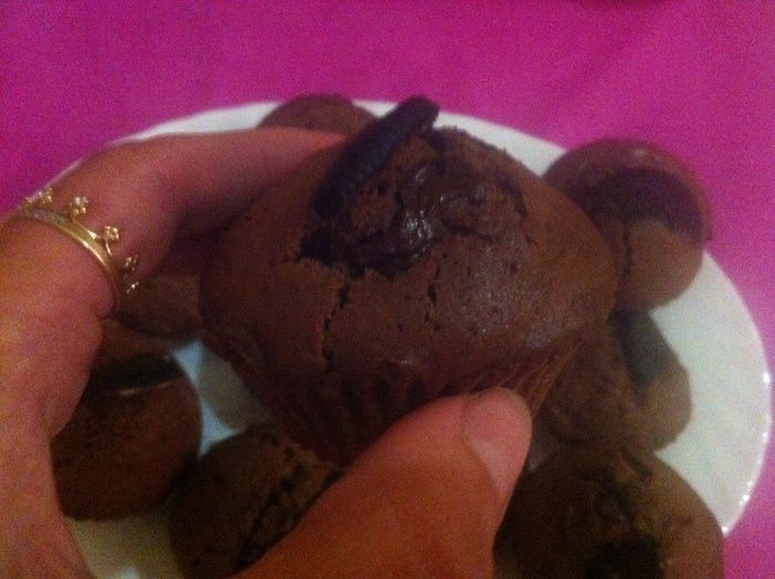 Смазываем силиконовые формочки маслом. На дно кладем целое печенье «Oreo», затем немного теста, чтобы закрыло печенье, далее пару долек горького шоколада (если хотите жидкую текучую начинку, шоколад можно заменить шоколадной пастой) и снова тесто. Сверху для украшения вставляем дольку печенья (можно печенье истолочь и посыпать сверху кекс). Ставим выпекаться в разогретую духовку до 180 — 190°С на 30 — 40 минут. Готовность проверяем зубочисткой. Если тесто не липнет, то кексы готовы.