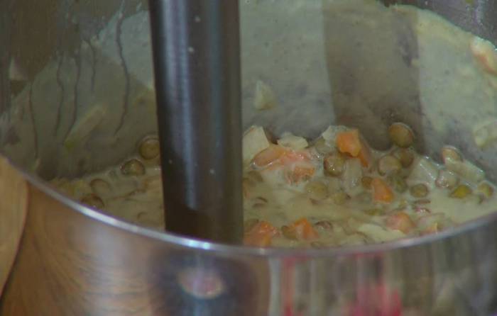 Суп посолить, влить немного горячей воды и взбить погружным блендером.